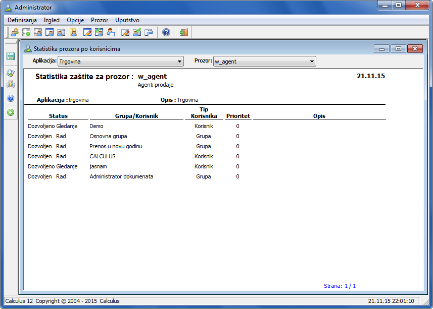 U ovom izveštaju, za određenu aplikaciju i prozor, koje birate u poljima filtera, dobija se pregled prava pristupa po svakom pojedinom korisniku i grupi korisnika, (vidi sliku).