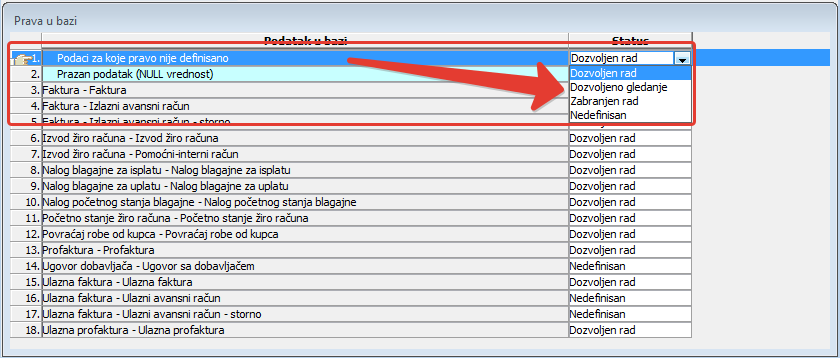 Podaci za koje pravo nije definisano - Ova opcija određuje koje će se pravo primenjivati na sve podatke tog objekta baze koji nemaju definisano pravo. Kada npr. dodelite prava korisnicima za rad sa vrstama dokumenata, a zatim definišete novu vrstu, svim korisnicima će pravo za tu vrstu biti nedefinisano, dok i za nju ne dodelite prava. U tom međuperiodu primenjivaće se pravo definisno ovom opcijom (vidi sliku)