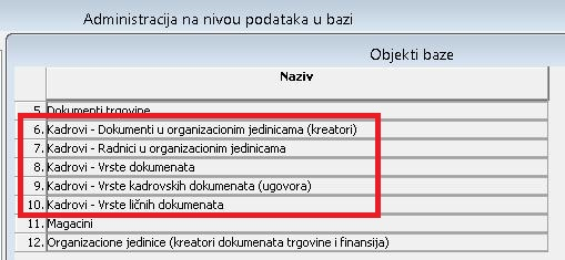 Preostala tri objekta baze "Kadrovi – Vrste dokumenata","Kadrovi – Vrste kadrovskih dokumenata (ugovora)" i "Kadrovi – Vrste ličnih dokumenata" (vidi sliku)