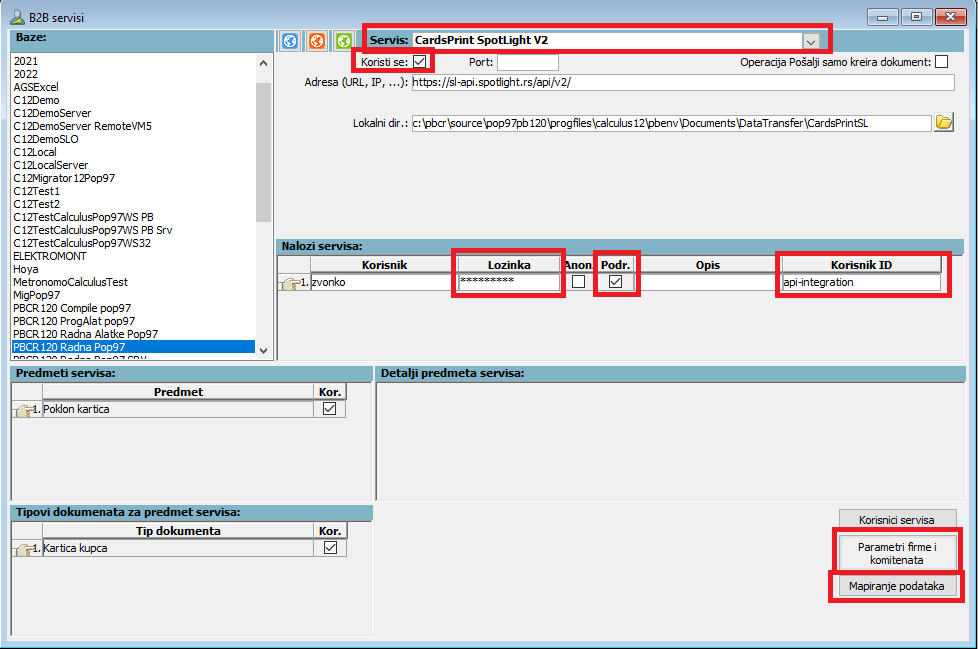 Za servis "CardsPrint SpotLight V2" je potrebno uključiti polje "Koristi se" i uneti jedan korisnički nalog (vidi sliku ispod). Kolone "Korisnik ID" i "Lozinka" treba popuniti korisničkim imenom i lozinkom koje korisnik dobije od servisa CardsPrint. U koloni "Korisnik" može da se unese bilo kakav naziv naloga. Treba uključiti i kolonu "Podr." (podrazumevani korisnik), tako da se preko tog naloga obavlja sva komunikacija.
