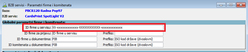 Dugmetom "Parametri firme i komitenata" treba otvoriti prozor za parametre i u polje "ID firme u servisu" uneti "API key" kojeg korisnik dobije od servisa CardsPrint, (vidi sliku).