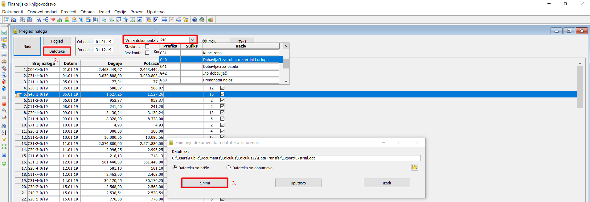 Pokrenite program "Finansijsko knjigovodstvo" i prijavite se u izvornu (source) bazu. Iz glavnog menija programa "Finansijsko knjigovodstvo" birajte "Pregledi → Pregled naloga". Pronađite i selektujte nalog glavne knjige koji treba izvesti u EkstNal.dat datoteku. Kliknite na dugme "Datoteka" i birajte folder (C:\Users\Public\Documents\Calculus\Calculus12\DataTransfer\Export), (vidi sliku)