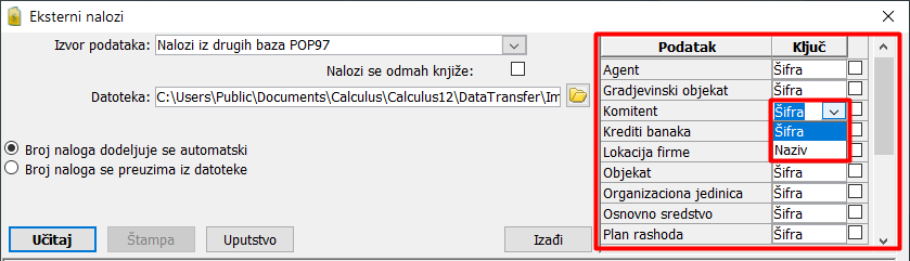 Sa desne strane nalazi se lista podataka koji se vezuju uz dokumente i njihove stavke i za koje je potrebno odrediti na koji se način raspoznaju pri učitavanju datoteke. Sistem prenosa je takav da se prenose samo dokumenti, ali ne i vezani osnovni podaci (komitenti, organizacione jedinice, radnici, vrste dokumenata itd). To znači da u bazi u koju učitavate dokumente svi ovi podaci moraju postojati pre učitavanja. Da bi se npr. određena stavka naloga vezala za odgovarajućeg komitenta, mora se definisati način raspoznavanja komitenata, po šifri ili po nazivu.