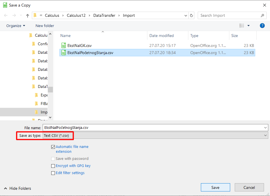 Nakon što popunite Excel tabelu sa podacima koje želite da učitate, tabelu je potrebno snimiti u odgovarajući format iz kog je moguće učitati unete podatke u Calculus. Kolone "Vrsta analitike", "Šifra analitike" i Naziv analitike" ne moraju biti popunjene ali je neophodno da sve kolone postoje kako bi format bio ispravan. Iz Excela preko opcije "File > Save As..." izaberite ime datoteke a ispod toga podesite format na Text CSV (*.csv), (vidi sliku)