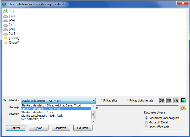 Snimanje u datoteke obavlja se iz stavki robnog dokumenta dugmetom "U datoteku". Otvara se prozor za "Izbor datoteke za eksportovanje podataka" u kojem se određuje putanja do datoteke u koju će biti snimljeni podaci. Ovu datoteku možete zatim poslati i učitati u neku npr. udaljenu bazu (vidi sliku)