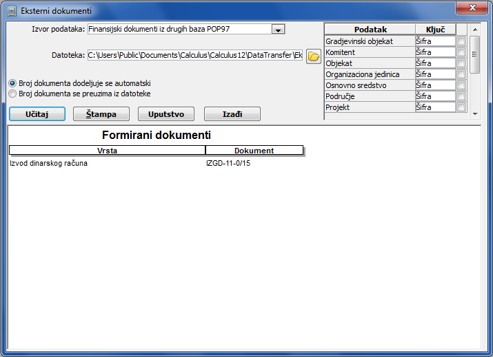 Lista importovanih dokumenata. Kad se koristi standardni prenos između dve baze koristi se opcija "Finansijski dokumenti iz drugih baza POP97", ali postoje i drugi formati, pisani za specifične potrebe u pojedinim preduzećima. U polje "Datoteka" treba uneti kompletnu putanju do datoteke iz koje će se dokumenti učitavati. Brojevi dokumenata koji će se učitati mogu se preneti u izvornom obliku iz originalne baze opcijom "Broj dokumenta se preuzima iz datoteke" ili izabrati generisanje novih brojeva opcijom "Broj dokumenta se dodeljuje automatski". Sa desne strane nalazi se lista podataka koji se vezuju uz dokumente i njihove stavke i za koje je potrebno odrediti na koji se način raspoznaju pri učitavanju datoteke.