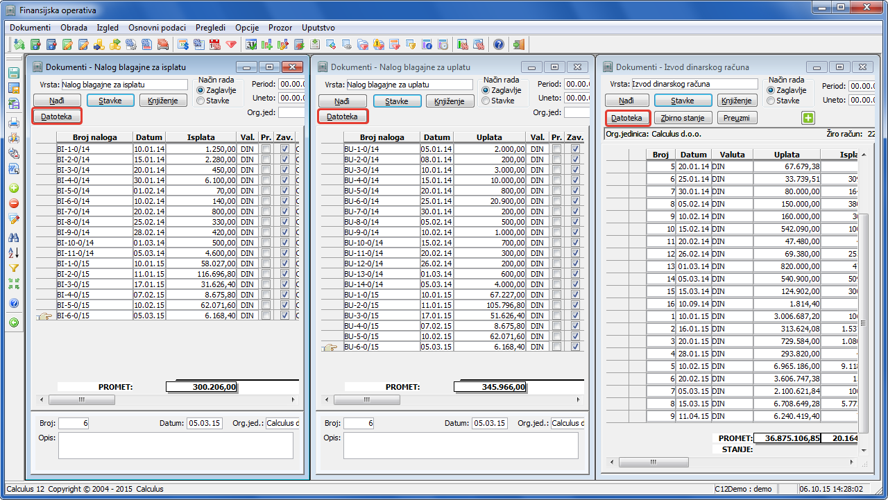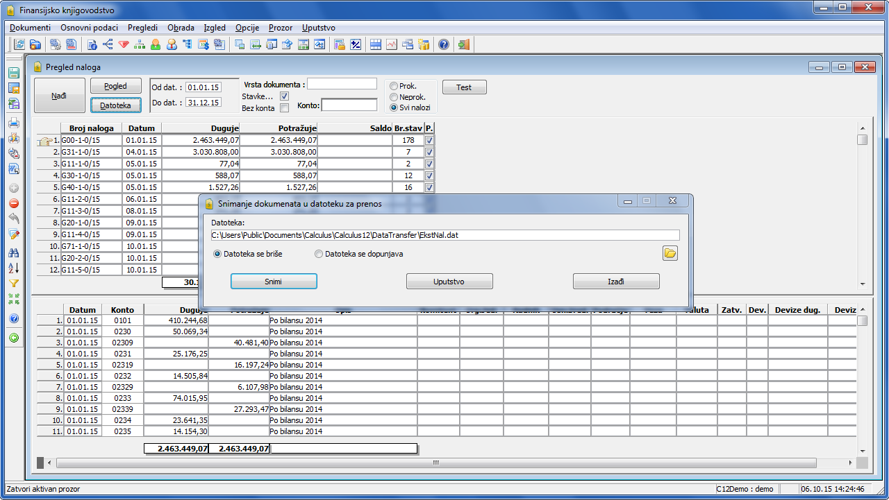Snimanje u datoteke obavlja se u finansijskom knjigovodstvu iz pregleda naloga, a u finansijskoj operativi iz zaglavlja izvoda žiro računa, naloga blagajni, knjige izlaznih u ulaznih profaktura dugmetom "Datoteka" (vidi sliku)