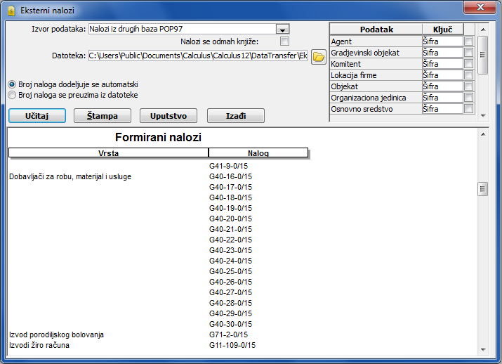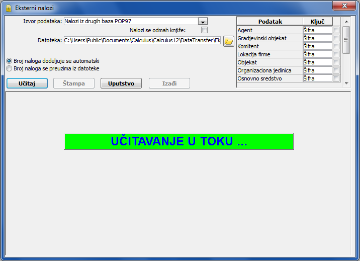 Učitavanje se obavlja kroz ovaj prozor, dostupan u finansijskom knjigovodstvu glavnog menija Dokumenti - "Otvori naloge - Eksterni nalozi" ili iz finansijske operative "Dokumenti - Otvori - Učitavanje eksternih dokumenata" (vidi sliku)