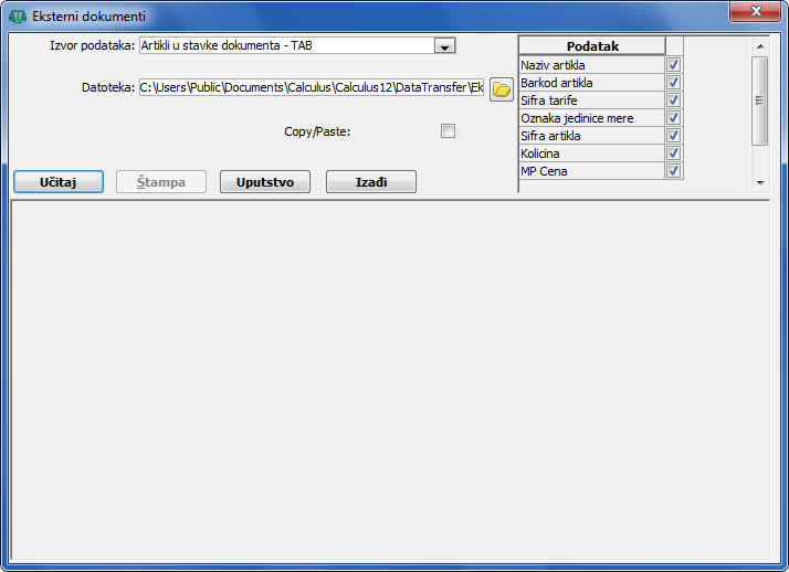 Podaci upućeni u datoteku za "Izvoz" snimaju se u datoteku koja će biti snimljena u fasciklu - "C:\Users\Public\Documents\Calculus\Calculus12\DataTransfer\Export", dok se podaci upućeni u datoteku za "Uvoz" biti u datoteci u fascikli - "C:\Users\Public\Documents\Calculus\Calculus12\DataTransfer\Import". Putanje i nazivi fascikla i datoteka mogu se davati proizvoljno.