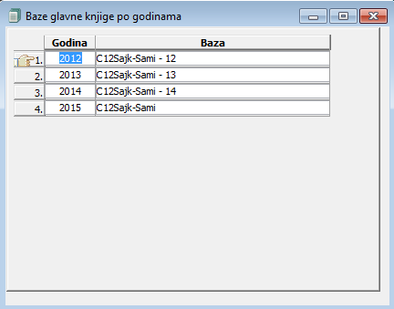 Prozor za izbor baza može sadržati baze po poslovnim godinama ali i baze iste poslovne godine koje se koriste u različitim poslovnicama itd. Za pristup bazama obratite se administratoru u Vašem preduzeću.