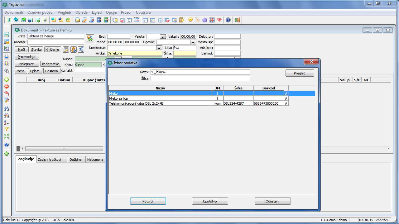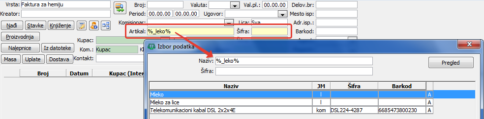 Prvi primer: Ako je u filteru za unos i pregled faktura u programu Trgovina isključena padajuća lista "Artikli", unesite deo naziva artikla i dvoklikom miša otvorite prozor za izbor podataka (vidi sliku)