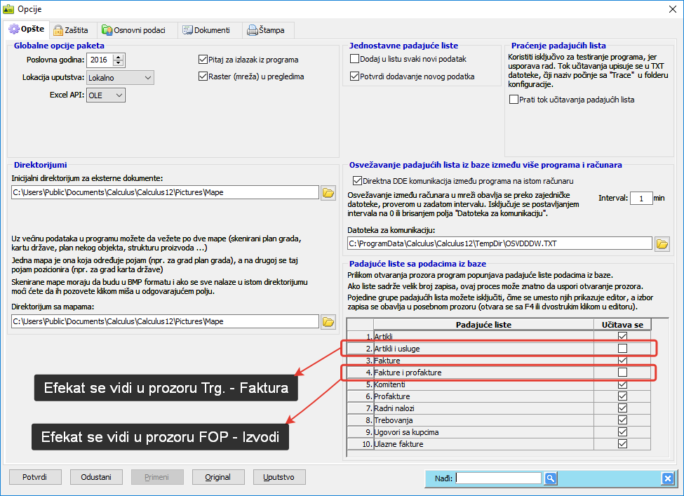 Isključivanje padajućih lista je mogućnost koja se primenjuje u izuzetnim slučajevima, a najčešće zbog zagušenja rada u mreži. Servis za uklanjanje padajućih lista možete aktivirati u svakom od programa Calculus-a 12 izborom stavke glavnog menija: "Opcije - Opcije programa... a zatim u listiću Izgled" potvrdite opciju .