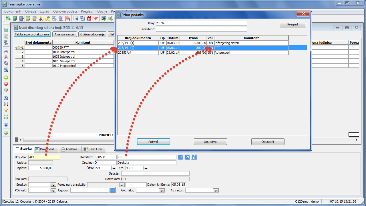 Drugi primer: Ako je u izvodima tekućih računa u finansijskoj operativi isključena padajuća lista za broj dokumenta, unosom broja dokumenta u editor moguće je da u bazi bude pronađeno više dokumenata sa istim brojem (npr. ulazne fakture različitih komitenata mogu nositi isti broj). U tom slučaju program ne može da odluči za koji dokument da veže uplatu, otvara ovaj prozor i izlistava sve dokumente koji nose uneti broj. Na vama je da ovde izaberete želejeni dokument: selektujete ga i potvrdite dugmetom "Potvrdi" ili dvostrukim klikom miša na red tog dokumenta (vidi sliku)