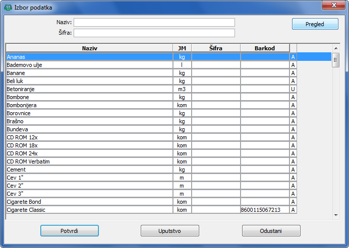 Prozor "Izbor podataka" u trgovini. Iz ponuđene liste odaberite traženi podatak i pritisnite dugme "Potvrdi".