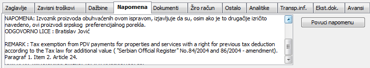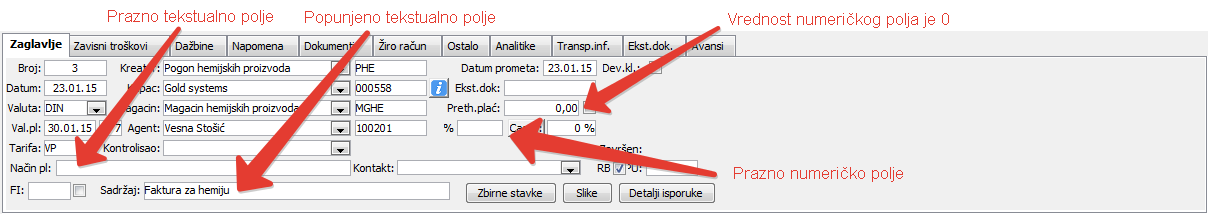Jedan od primera je polje u kojem se popunjava odobreni procenat agentu. Ako je polje prazno to znači da taj agent nema specificiranu nikakavu proviyiju i da će se kod kreiranja fakture primenjivati standardna provizija. Ako se u polje upiše nula to je konkretna vrednost i tada se podrazumeva da tom agentu ne pripada provizija (vidi sliku)