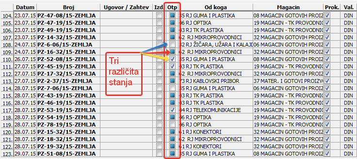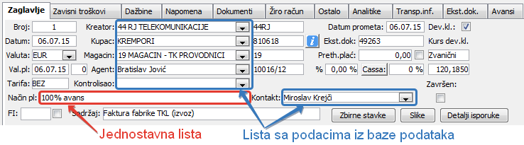 Postoji značajna razlika u ova dva načina izbora podatka. Kada vršite izbor mišem, onda listu pregledate povlačeći vertikalni klizač i podatak birate tek kad ga vidite u listi. Kada se krećete kursorskim tasterima po listi, svaki pritisak na taster odmah bira sledeći podatak, tako da prolaskom kroz npr. nekoliko desetina podataka da biste došli do željenog vi zapravo isto toliko puta potvrđujete unos u polje. Ovo je problematično u slučajevima kada unos takvog podatka povlači za sobom čitav niz drugih operacija, koje obrađuju neke dodatne podatke i upisuju ih u ostala polja ekrana, pa se čitav taj niz operacija enormno povećava.