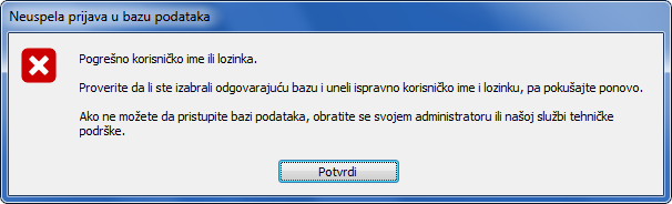nećete moći da se prijavite bazi, uz sledeću poruku (vidi sliku)