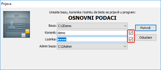 Pored polja za unos korisničkog imena i lozinke nalaze se polja za potvrđivanje. Uključivanjem ovih polja, korisničko ime i/ili lozinka biće, posle prijave bazi, upamćeni. Prilikom sledeće prijave bazi, ta će polja biti automatski popunjena. Ovu mogućnost možete koristiti da ne biste svaki put morali unositi korisničko ime i lozinku.
