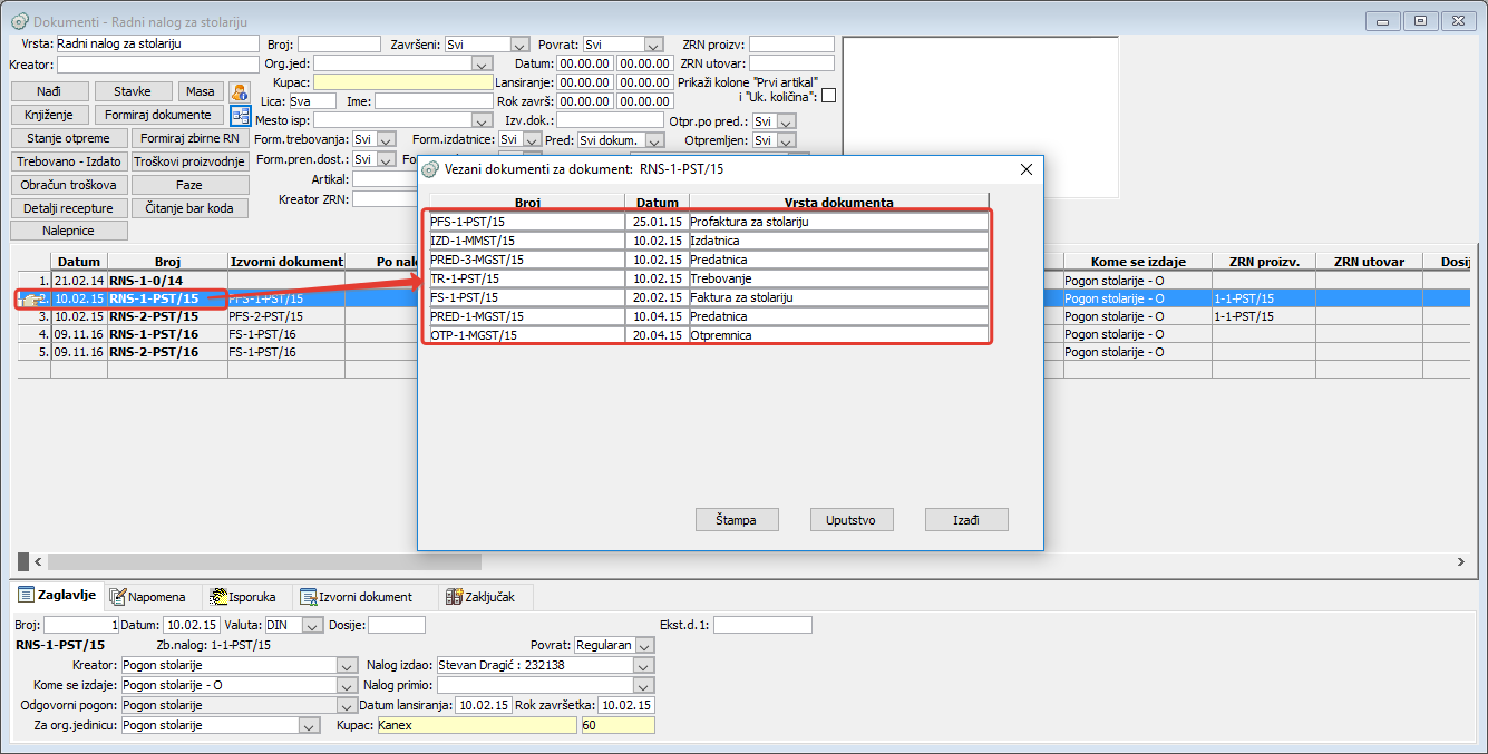 Dvostrukim klikom miša na neki od dokumenata u prozoru za vezanih dokumenata možete otvoriti njegove stavke, naravno ako vam je administrator dodelio prava za pristup tom dokumentu.