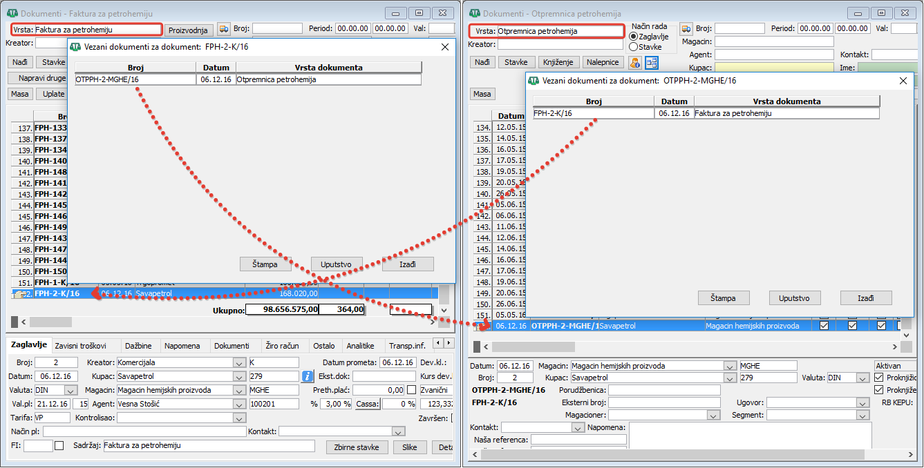 Prozor za prikaz vezanih dokumenata - faktura/otpremnica i obrnuto.
