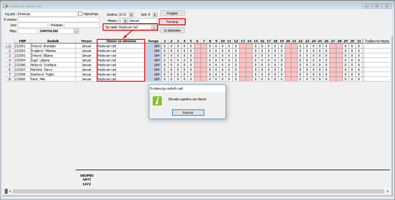 Sada kada ste postavili filter, kliknite na dugme "Formiraj" kako bi se na osnovu postavljenog tipa rada generisali zapisi po radnicima za evidenciju radnih sati, ( vidi sliku )