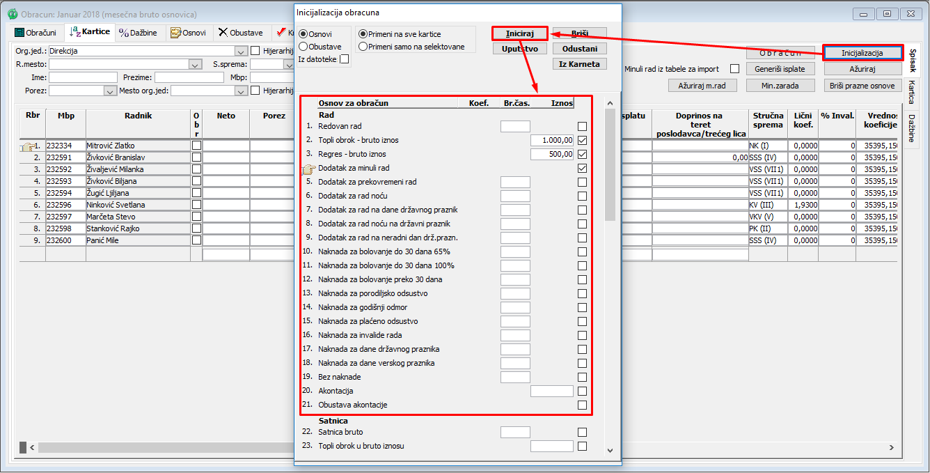 . Nakon ove dvostruke inicijalizacije kartica za obračun sadrži osnove preuzete i inicijalizovane iz evidencije radnig sati (karnet) i one koje ste sami inicijalizovali (uključili u obračun), ( vidi sliku )