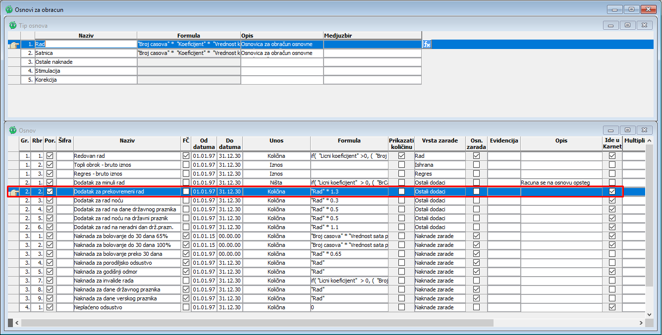 U okviru evidencije "Osnovi za obračun" dodatak za prekovremeni rad definisan je u podprozoru "Osnov" u koloni "Naziv",
