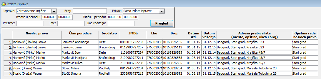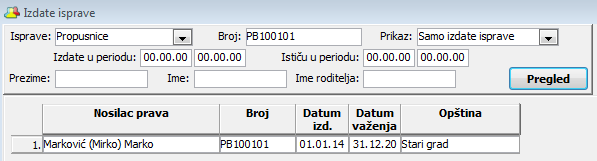 U okviru prozora "Izdate isprave" dobijaju se informacije o izdatim ispravama kao što su zdravstvene knjižice ili propusnice.