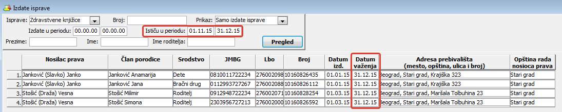 .Propusnice ili zdravstvene knjižice možete izlistati za period kada su istekle ili će isteći unosom datumskog opsega u polje "Ističu u periodu:" ( vidi sliku )