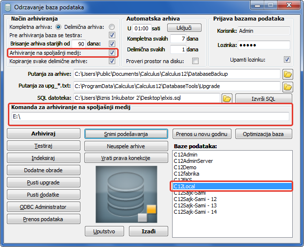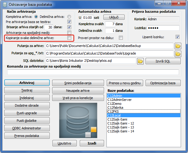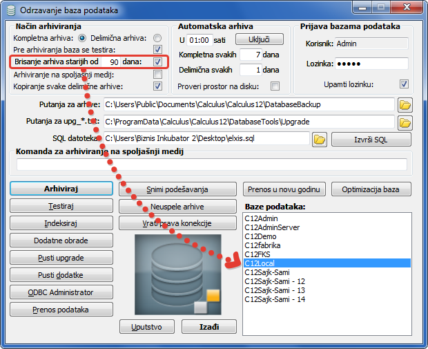Direktorijum za arhiviranje upisuje se u polje "Putanja za arhive:" (C:\Users\Public\Documents\Calculus\Calculus12\DatabaseBackup). Kao što smo ranije rekli, ovo može biti putanja na drugom računaru odnosno rdnoj stanici ili barem drugom disku na serveru, ako je to moguće.