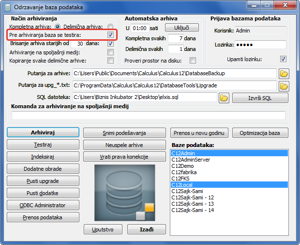 Ako uključite opciju "Pre arhiviranja baza se testira" (vidi sliku)