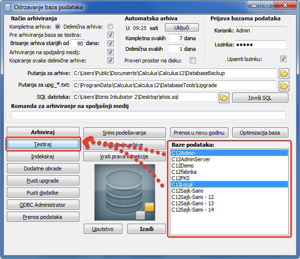 Ako u toku testiranja dođe do prijave greške i neregularnog prekida baza je oštećena. Odmah obustavite bilo kakav rad nad bazom i pozovite našu servisnu službu.