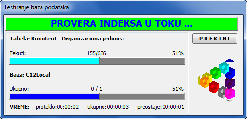 Tokom testiranja baze proverava se integritet ključnih indeksnih tabela (vidi sliku)