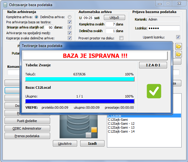 Procedura za testiranje baze porukom "Baza je ispravna" izveštava vas da je testiranje uspešno proteklo i da se baza možete koristiti (vidi sliku)