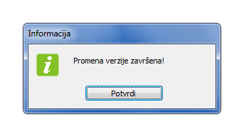 Prozor za praćenje promena varijanti..Nadogradnja (upgrade) je uspešno završena porukom "Promena verzije završena". Kliknite na dugme "Potvrdi" za kraj. (vidi sliku)