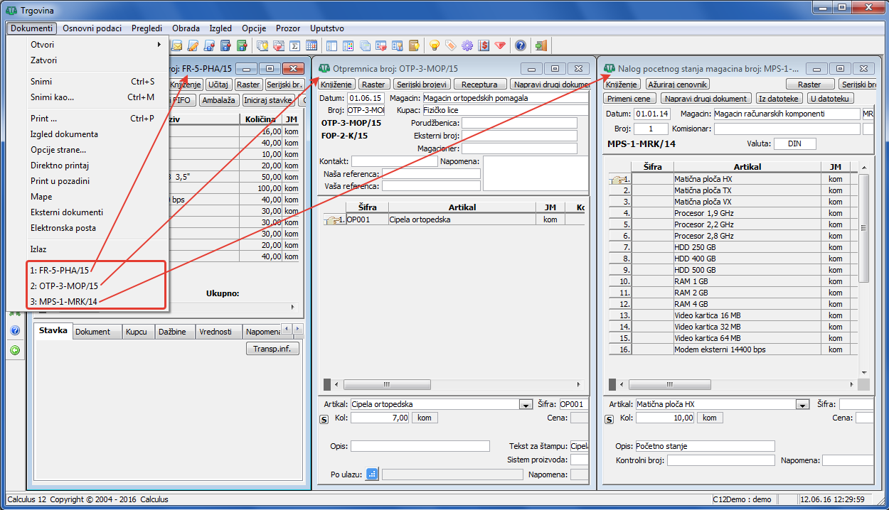 Svaki put kada otvorite prozor sa stavkama nekog dokumenta, broj tog dokumenta se pamti u istoriji. Istorija otvaranja dokumenta vodi se odvojeno za svakog korisnika i svaku bazu podataka. Kada zaželite da ponovo otvorite stavke dokumenta kojeg ste skoro otvarali, ne morate da ponovo ulazite u prozor za zaglavlja i tražite taj dokument. Istorija poslednjih dokumenata koji su otvarani nalazi se u krajnjoj levoj opciji glavnog menija "Dokumenti", na dnu ( vidi sliku )
