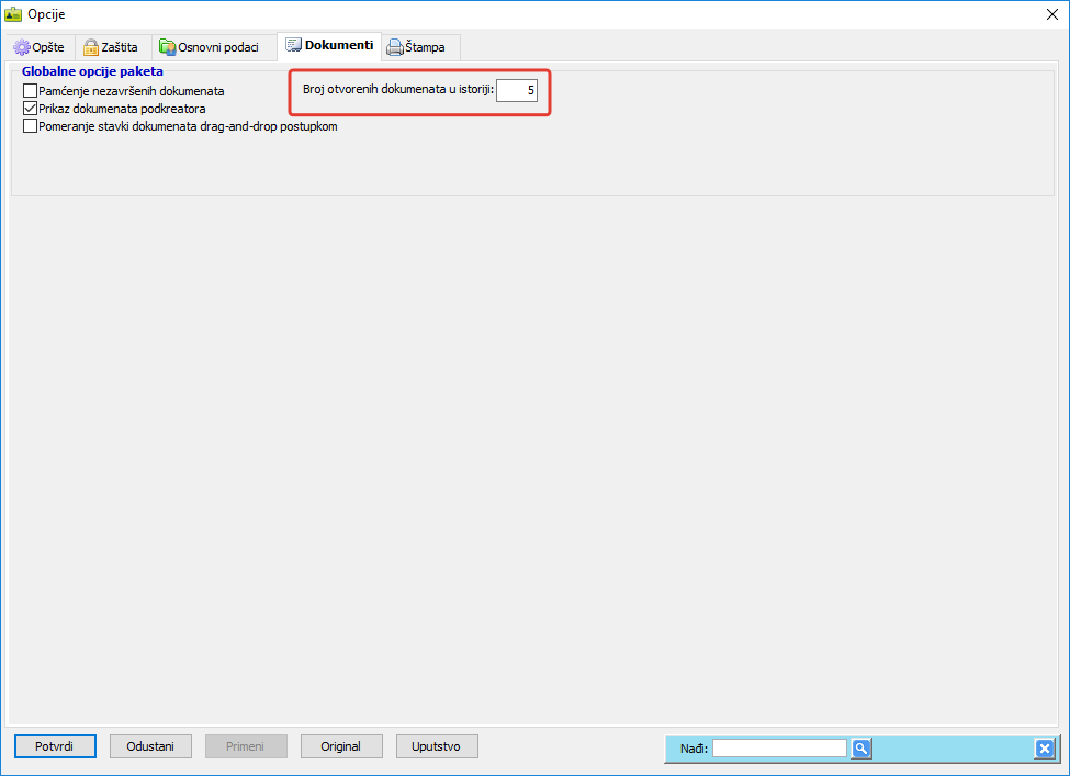 Tu su prikazani brojevi poslednjih nekoliko otvorenih dokumenata, složeni tako da se poslednji dokument uvek nalazi na vrhu. Dovoljno je da u meniju izaberete dokument da biste direktno ušli u prozor sa njegovim stavkama. Standardno je broj upamćenih dokumenata postavljen na 5, ali u prozoru "Opcije programa, listić "Dokumenti" možete promeniti ovaj broj. Omogućeno je najviše 20 dokumenata, a ako ne želite da se ta istorija vidi , postavite ovu opciju na "0" ( vidi sliku )