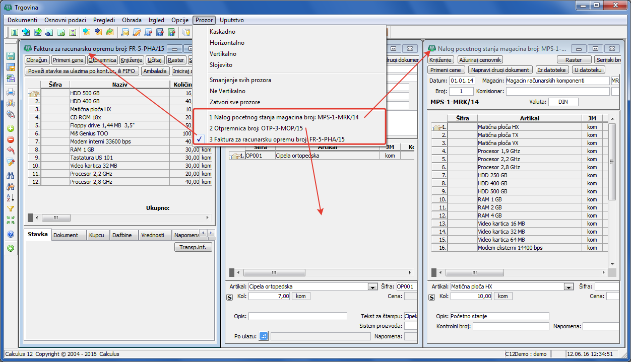 Svaka poslovna promena (transakcija) u osnovi je propraćena određenim dokumentom. Tog smo se principa držali i u projektovanju Calculus-a 12. Dakle, svaka promena, bez obzira da li ona odražava neku finansijsku transakciju, promet robe, izvršenu uslugu, kadrovsku promenu itd., mora biti evidentirana u obliku nekog dokumenta. Jednostavno rečeno, ne možete npr. uneti direktno stavku u robnu ili finansijsku karticu. Promena mora biti uneta kroz neki dokument, a stavke tog dokumenta po određenim pravilima pojaviće se u odgovarajućoj kartici knjiženjem dokumenta. Dokument nosi osnovne informacije o poslovnoj promeni, kao što su datum, ko je kreirao dokument, kome je dokument izdat itd.