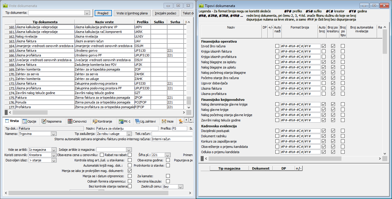 Za svaku vrstu dokumenta, bez obzira kojem tipu pripada, obavezan je unos dva podatka, koji jedinstveno definišu vrstu dokumenta na nivou čitave baze podataka: Naziv i Prefiks. Prefiks je zapravo šifra vrste dokumenta, koja mora biti jedinstvena na nivou svih tipova, odnosno na nivou čitave baze podataka. Prefiks može sadržavati i brojeve i slova (alfanumerike).