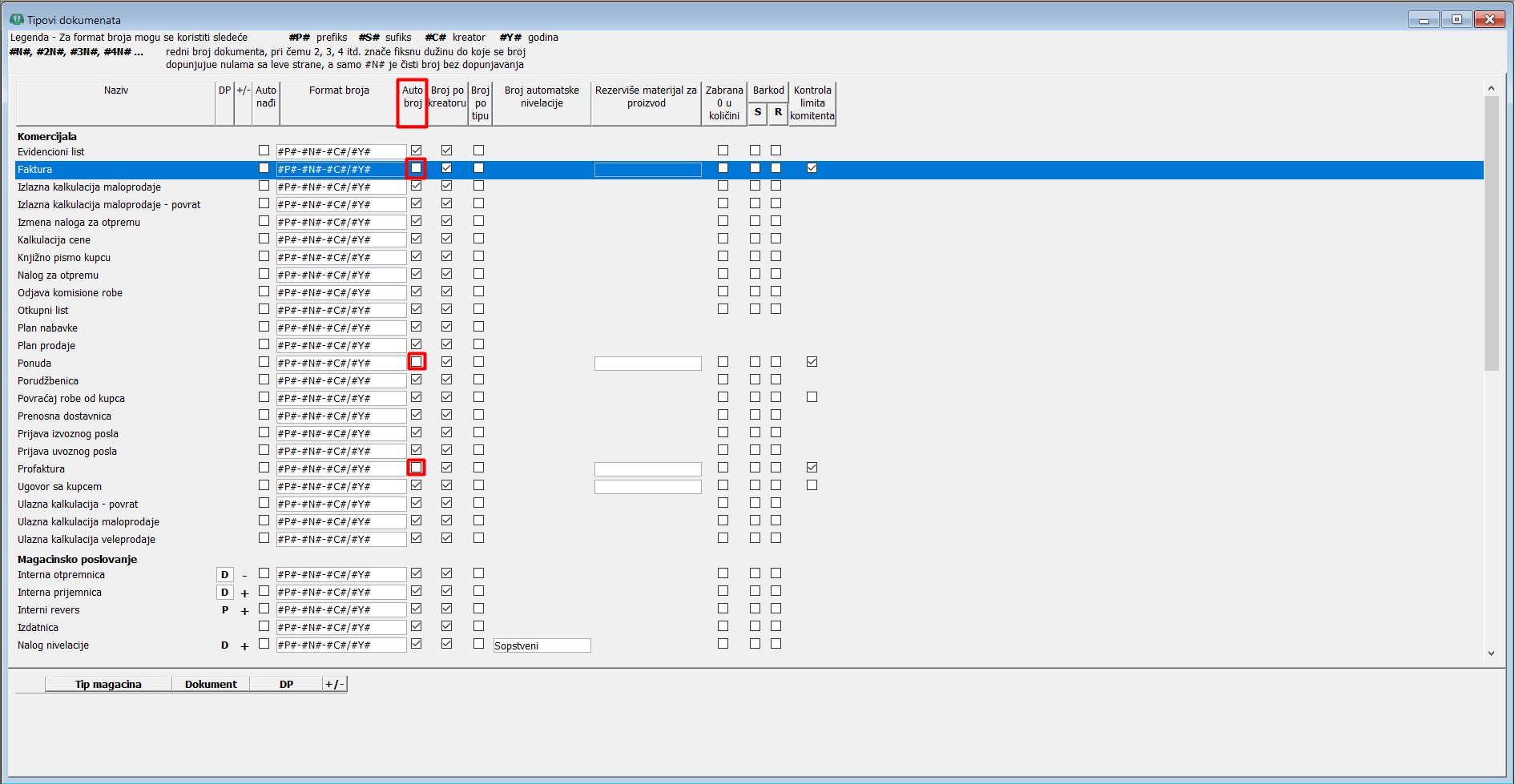 Dalja kontrola brojača postiže se takođe u prozoru za tipove dokumenata isključivanjem polja "Auto.broj". Ovo potpuno isključuje automatsko formiranje brojeva i u prozoru za obradu dokumenata u polju "Broj", umesto rednog broja, sada je moguće uneti kompletno broj onako kako vama odgovara. Ova mogućnost može da dovede do toga da brojevi više ne budu jedinstveni na nivou cele baze i treba je izbegavati, ali ponekad je neophodna.
