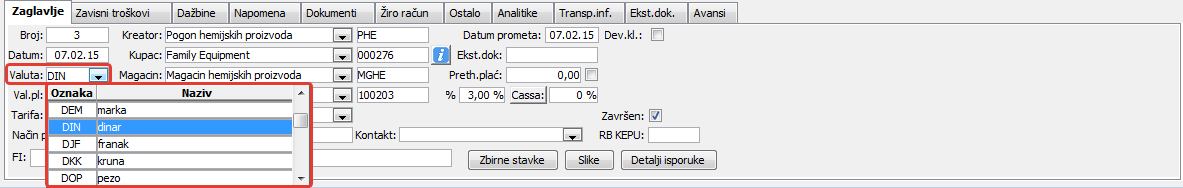 Svaki dokument koji operiše sa novčanim iznosima ima polje za određivanje valute. Inicijalno se, pri unosu novog dokumenta automatski dodeljuje glavna valuta, ali vi je uvek možete promeniti ( vidi sliku )