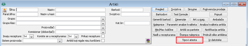 U prozorima artikala dodato je novo dugme "Tipovi atesta", ( vidi sliku )