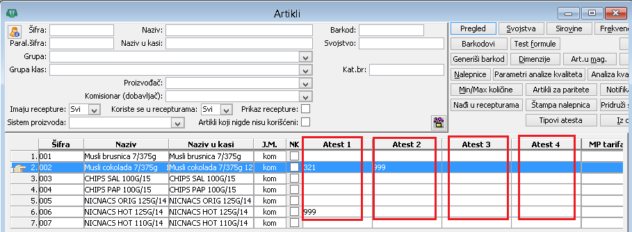 U spisku artikala (srednjem delu prozora Artikli) su dodate četiri nove kolone „Atest 1“, „Atest 2“, „Atest 3“ i „Atest 4“. U ovim kolonama će se prikazati oni atesti artikla čiji tip atesta ima redosled prikaza 1, 2, 3 ili 4, ( vidi sliku )