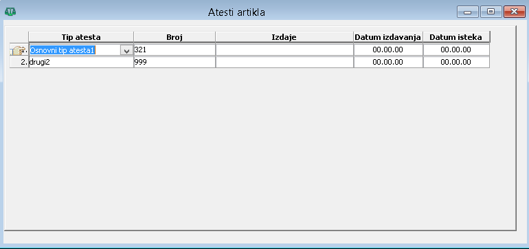 Za unos dodatnih atesta artikla potrebno je kliknuti na plavo dugme desno od polja „Kontrola isteka“, pri čemu se otvara prozor atesta trenutno izabranog artikla, ( vidi sliku )