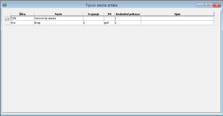 Obavezna polja su Šifra i Naziv, dok su Trajanje, Jedinica mere trajanja, i Opis neki osnovni opisni atributi koji nisu obavezni. Iako polje Redosled prikaza nije obavezno, ono mora biti popunjeno brojevima 1, 2, 3 ili 4 zavisno od toga u kojoj koloni odgovarajući atest artikla želimo da prikažemo u spisku artikla (videti prikaz atesta kasnije).