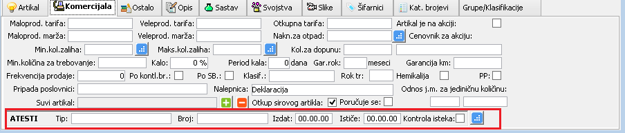 Za unos atesta određenog tipa na konkretnom artiklu možemo koristiti polja u tab-u Komercijala: Tip, Broj, Izdat, Ističe, ( vidi sliku )