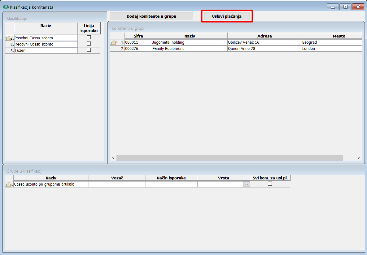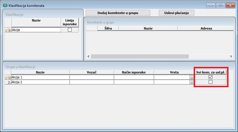 Na grupama u klasifikaciji uključivanje polja u koloni "Svi kom. za usl.pl." (Svi komitenti za uslove plaćanja), grupa automatski obuhvata sve komitente kod određivanja uslova plaćanja definisanih na toj grupi, pa na takvoj grupi nije potrebno dodeljivati komitente, (vidi sliku)