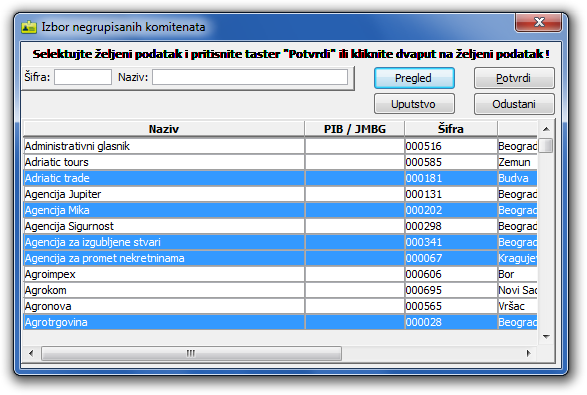sa spiskom svih komitenata koji nisu razvrstani unutar te klasifikacije. Sada možete selektovati više komitenata odjednom i ubaciti ih