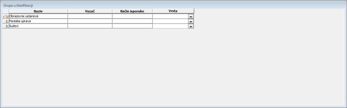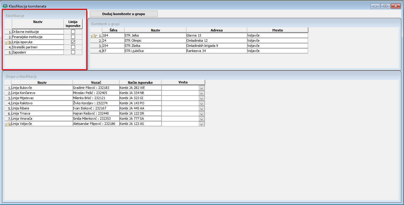 . - Definisati grupe u klasifikaciji, koje će predstavljati linije isporuke. Za svaku grupu može se uneti vozač (iz padajuće liste radnika) i način isporuke ili registarski broj vozila. Vozači i vozila se prema potrebi mogu menjati (vidi sliku)