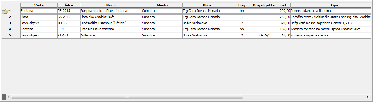 Lista sa pregledom građevinskih objekata zauzima središnju oblast prozora "Građevinski objekti". Sadrži pregled podataka unetih